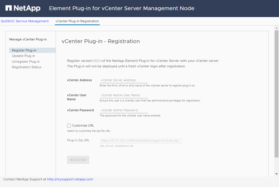 Plugin de Element vCenter versión 4.10 o anteriorAparece la página Registro del plugin de vCenter: