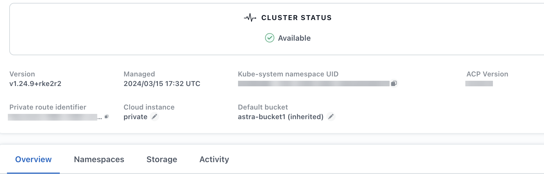 Une fois Astra Control Provisioner installé, le cluster qui héberge le provisionneur dans l'interface utilisateur Astra Control affiche un ACP version champ plutôt que Trident version et le numéro de version installée actuel.