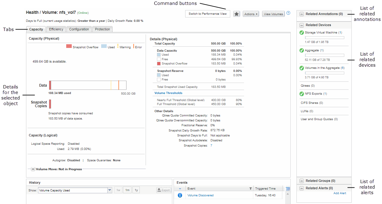 Entender os layouts típicos de janelas ajuda você a navegar e usar o Active IQ Unified Manager de forma eficaz. A maioria das janelas do Unified Manager é semelhante a um dos dois layouts gerais: Lista de objetos ou detalhes. A configuração de exibição recomendada é de pelo menos 1280 por 1024 pixels.