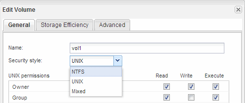A caixa de diálogo Editar volume é exibida, mostrando o estilo de segurança atual do volume, que é herdado do estilo de segurança do volume raiz SVM.