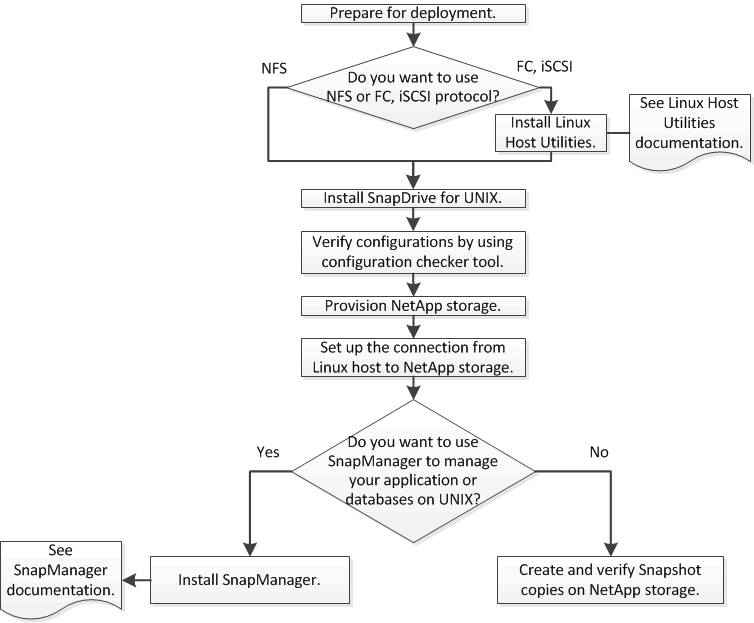 Antes de criar cópias Snapshot com o SnapDrive, você deve instalar Utilitários de host do Linux (se estiver usando o protocolo FC ou iSCSI), instalar o SnapDrive para UNIX, verificar as configurações compatíveis com o SnapDrive, provisionar o storage e configurar a conexão do host do Linux com o sistema de storage NetApp.