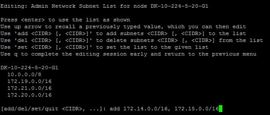 add 172.14.0.0/16, 172.15.0.0/16, 172.16.0.0/16Você pode reduzir a quantidade de digitação necessária usando "'seta para cima'" para recuperar valores digitados anteriormente para o prompt de entrada atual e, em seguida, editá-los, se necessário. A entrada de exemplo abaixo mostra a adição de sub-redes à Lista de sub-redes de Admin Network: