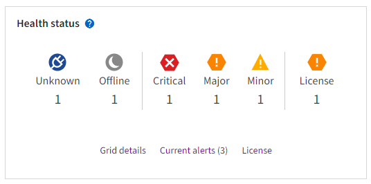Requer atenção imediata. Selecione cada alerta e siga as ações recomendadas. Por exemplo, talvez seja necessário reiniciar um serviço que tenha parado ou reiniciado o host para o nó. Nota: Um nó pode aparecer como desconhecido durante operações de desligamento gerenciado. Nesses casos, você pode ignorar o estado desconhecido. |