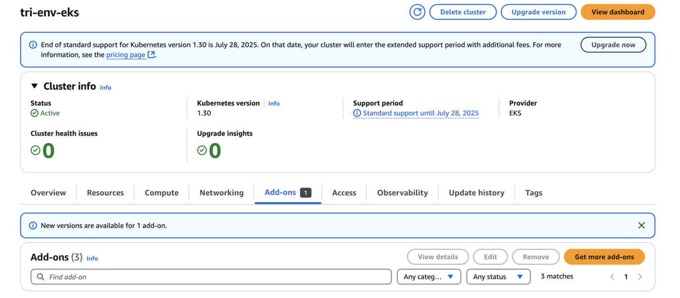 No cluster do EKS Kubernetes, navegue até a guia Complementos.