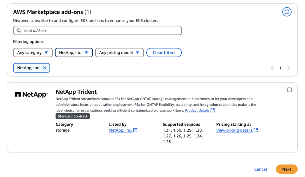 Localize NetApp Trident e marque a caixa de seleção do complemento Trident e clique em Avançar.