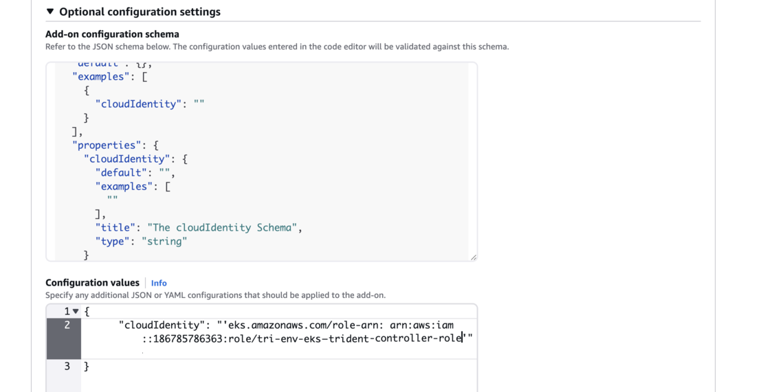 Siga o esquema de configuração Add-on e defina o parâmetro Configuration values na seção Configuration values para o Role-arn criado na etapa anterior(Etapa 1) (o valor deve estar no seguinte formato:
