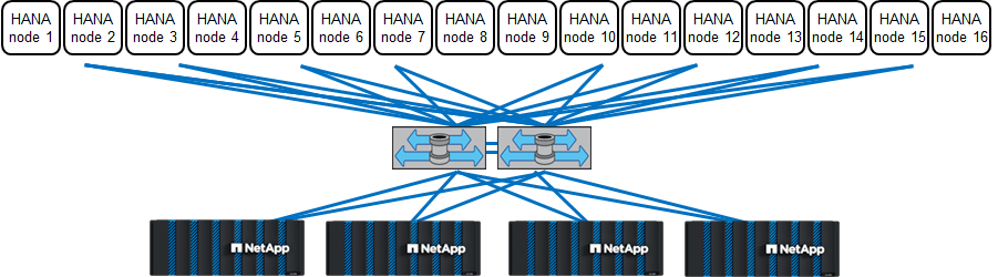 下圖顯示儲存控制器連接更多SAP HANA主機的組態範例。在此範例中、需要更多磁碟櫃來滿足16台SAP HANA主機的容量和效能需求。視總處理量需求而定、您必須新增額外的FC連線至儲存控制器。