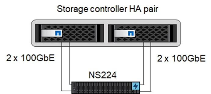 每個 NS224 NVMe 磁碟櫃每個控制器都連接兩個 100GbE 連接埠,如下圖所示。每個機櫃內的磁碟必須平均分配給HA配對的兩個控制器。